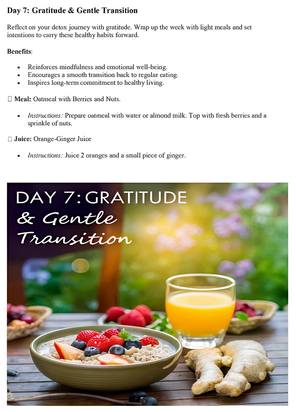 Kickstart your year with the "7-Day Healthy Natural Detox Plan," designed to cleanse your body gently and boost your energy levels. This comprehensive program offers simple, accessible steps to promote overall well-being without resorting to extreme measures. Each day features nutrient-dense meals, refreshing juices, and mindful practices to support digestion, hydration, and emotional balance.