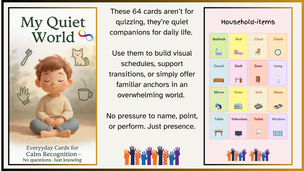 This bundle includes “Coming Home”, a 19-page story that validates the exhaustion of school and the quiet relief of a pressure-free return, and “My Quiet World,” 64 printable cards (Daily Routines, Animals, Body Parts, Household Items) reimagined as calm companions, not flashcards to quiz.