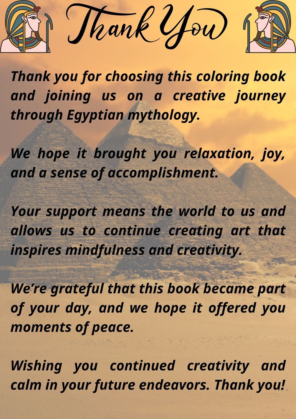 Welcome to this Egyptian mythology-inspired coloring book, designed especially for adults seeking creativity, relaxation, and reflection.
