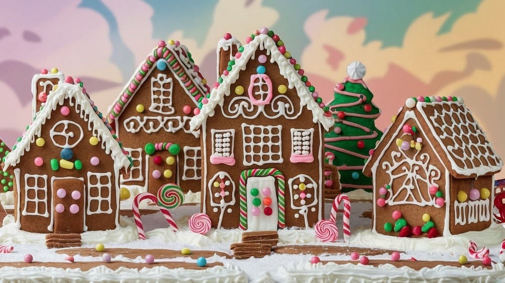 · Festive Decorations: The scene includes candy canes, lollipops, and other sweets placed around the village, adding to the festive cheer. A decorated Christmas tree made of gingerbread and icing stands proudly within the village.