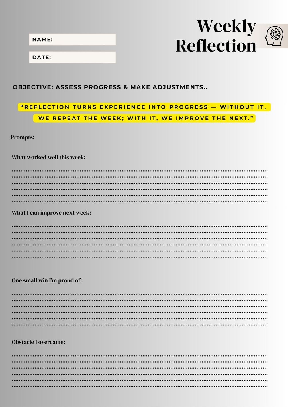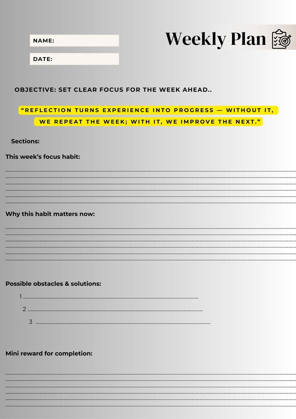 ✔ Celebrate micro-wins with weekly reflections & monthly progress logs