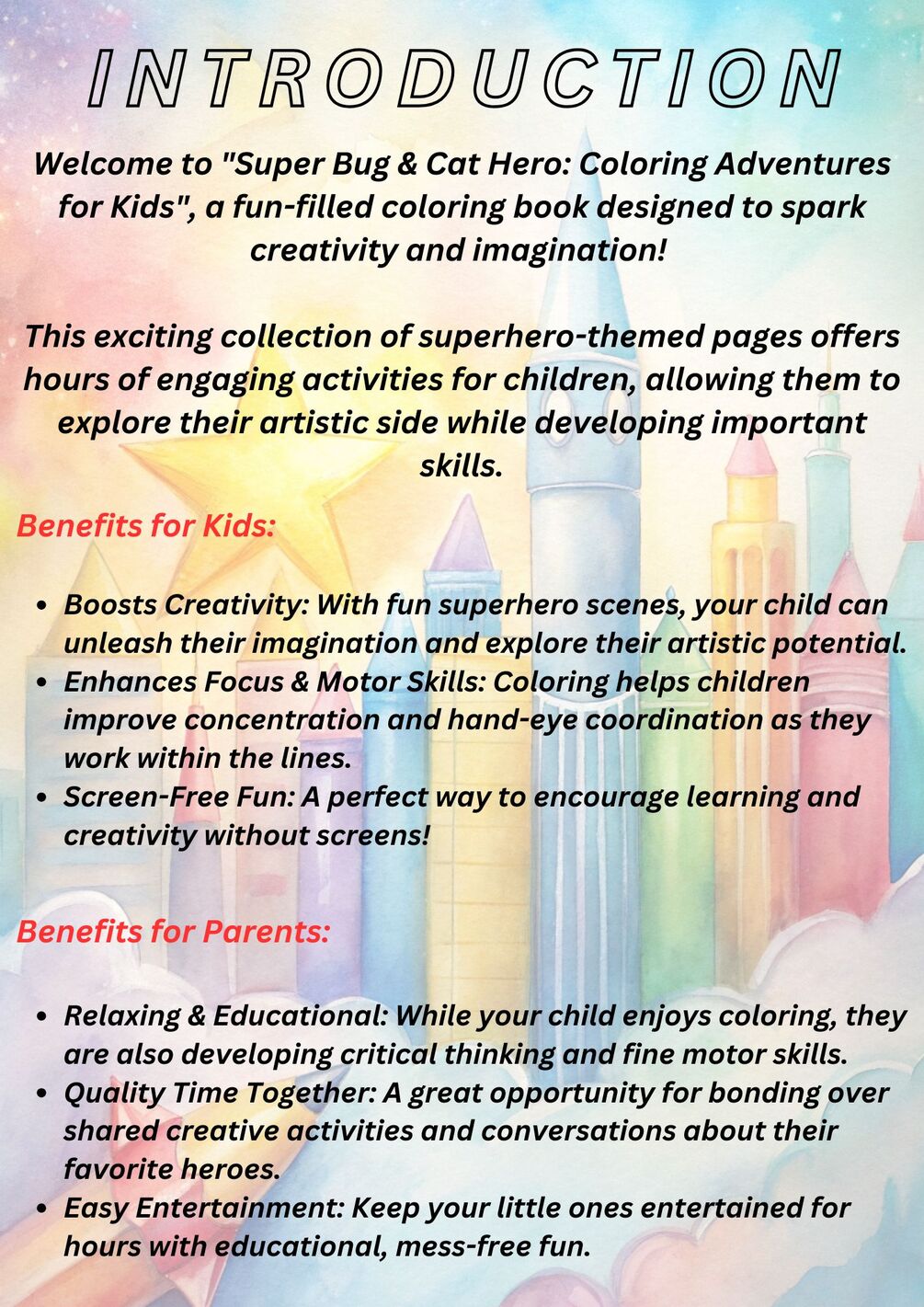 Welcome to "Super Bug & Cat Hero: Coloring Adventures" for Kids, a fun-filled coloring book designed to spark creativity and imagination! This exciting collection of superhero-themed pages offers hours of engaging activities for children, allowing them to explore their artistic side while developing important skills.